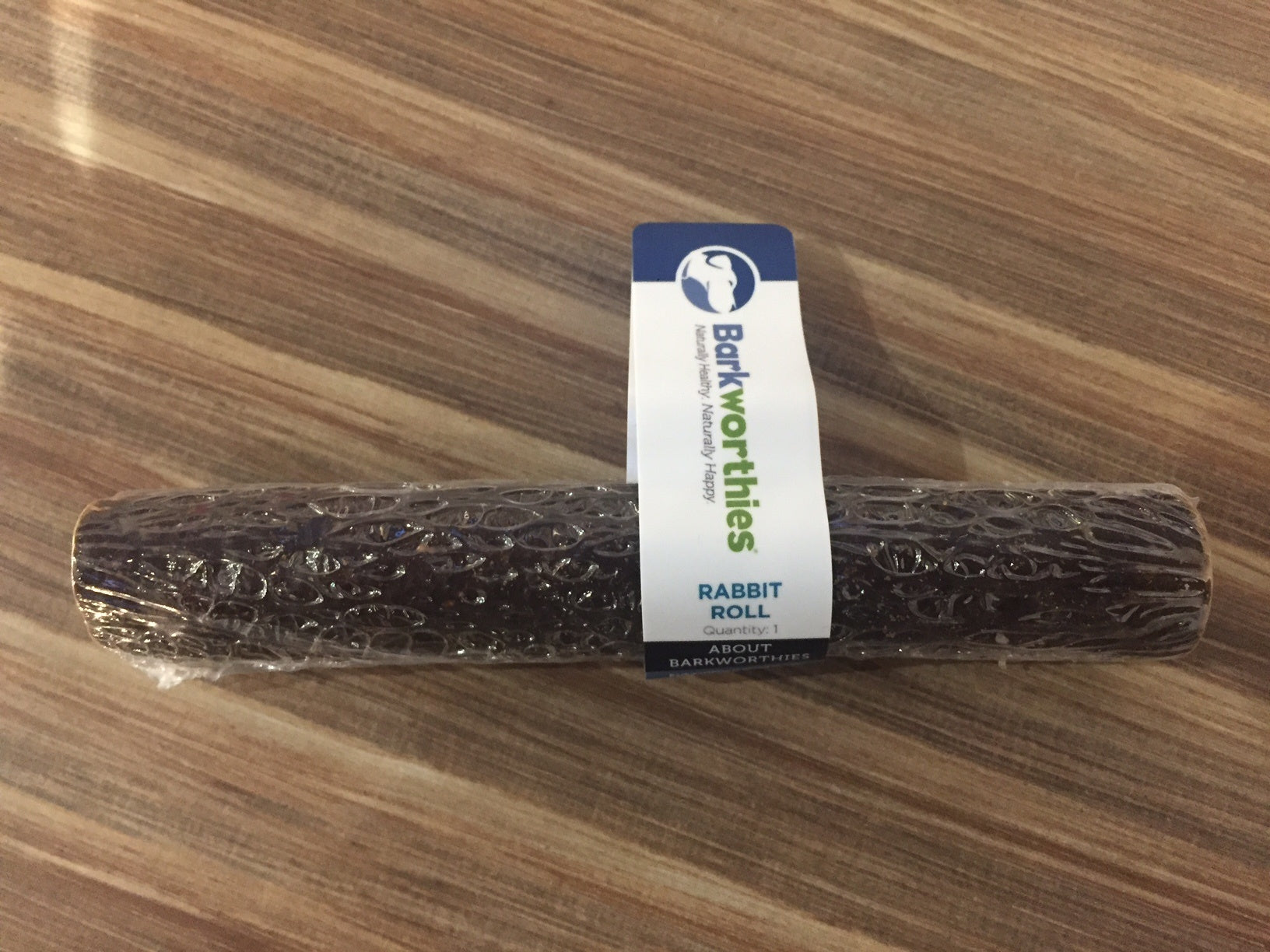 Barkworthies Natural Rabbit Sausage is an approximately 6 inch long chew made of free-range, grass-fed Argentinian rabbit. Easily cut into smaller pieces, this all-natural dog treat can be given whole or cut down into popable pieces – perfect for a small dog treat or for use as a training aid!